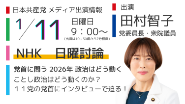 お知らせ 【メディア出演】1月11日(日)田村智子委員長がNHK「日曜討論」に出席します