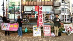 東京都中央区の築地市場に隣接する波除(なみよけ)神社前で16日、市場で働く人に勤労感謝を伝え、豊洲新市場(江東区)への移転反対を訴える「築地応援アクション」が行われました。
