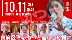 親子連れでにぎわう公園の前で宣伝する小松あゆみ区議予定候補 (左)と練馬まんなか世代後援会のメンバー=17日、東京都練馬区(練馬まんなか世代後援会撮影)