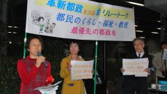 訴える(左から)目黒、山添、とや、の各氏と司会の近藤なつ子新宿区議=15日、東京・新宿駅東口(「しんぶん赤旗」提供)