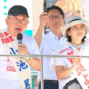 江東区の亀戸駅前での演説では、1923年の関東大震災で警察などがデマを流し朝鮮人や中国人を虐殺したことに触れ、「ここ亀戸では労働組合の幹部らが虐殺された。排外主義は戦争への道だと警戒しなければならない」と指摘。低賃金、低年金、高学費などの原因は外国人ではなく政治にあると述べ、「自民党政治を本格的に終わらせる。最も力になる日本共産党を伸ばしてください」と呼びかけました。