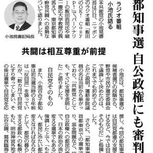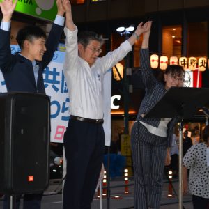 小池氏は、自民党が萩生田光一都連会長名の文書で「蓮舫による共産党主導の革新都政を絶対阻止しなければ」と述べていたことに言及。「失礼で時代錯誤。しかしこんなことしか言えないところまで市民が追いつめている」と語りました。「このたたかいを主導しているのは、都政を変えようとここに集まった市民の皆さんだ」とも話しました。