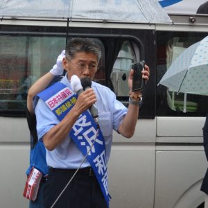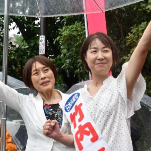 大つき候補と確認書を調印した「市民と政治をつなぐ江東市民連合」の宇都宮健児氏は「蓮舫知事を支える都議を増やさなければいけない」と訴え。4月の衆院補選(江東区)の共闘候補・酒井なつみ衆院議員(立憲民主党)は「ボトムアップで政策を作る大つきさんを都政に」と応援演説をしました。