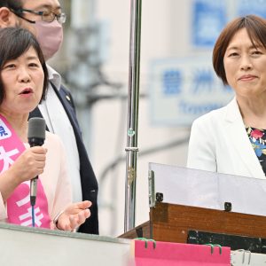 板橋区の竹内愛候補は、田村智子共産党委員長、五十嵐やす子社民党区議、和田悠立教大学教授の応援を受け、区議21年間の思いを振り返りながら都議会議員に挑む決意を語りました。