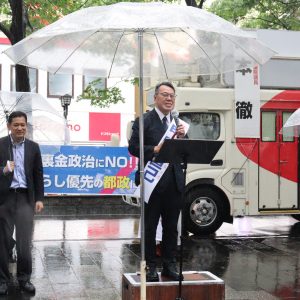 北区選挙区では、せいの恵子候補がJR赤羽駅前で、山添拓参院議員と新社会党の福田光一区議の応援を受けて第一声。区議を2期5年務めた経験を踏まえ「都政と区政のパイプ役になる」と決意を語りました。曽根はじめ都議が司会を務めました。
