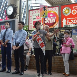 多くの市民らがスピーチ。武蔵野市で喫茶店を経営する鈴木なりささんは、障害のある幼い子どもを育てている在日コリアンの友人の思いを語り、「蓮舫さんが都知事になったら、どんなルーツを持っている人も大切にしてくれる」と語りました。