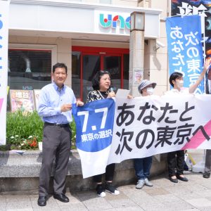 東京都知事選挙(7日投票)と同日に行われる都議会補欠選挙まで残り数日となり、選挙戦が終盤に向かう中、府中市選挙区の甲田直己都議候補=無所属=(日本共産党支援)は市内各所で街頭宣伝に取り組んでいます。