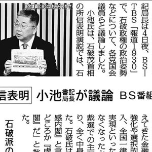 司会の反町理氏から党首討論となった場合、日本共産党として短い質疑時間の中で「どう論戦を組むのか」と問われ、「『アジア版NATO』創設や核共有など、石破首相が言いたかったことが所信表明では封じられているとも評価されるが、危険な軍事突出は表れている」と発言。「日米軍事同盟絶対の姿勢はより強まった」と指摘し、岸田政権のもとで進められた軍事費倍増や、敵基地攻撃能力の保有、殺傷能力のある武器輸出の解禁なども含めた「戦争する国づくり」への踏み出しについて、「一層、危険なところに踏み込もうという意図がある」と強調しました。