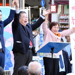 日本共産党の市田忠義副委員長は15日、東京都の八王子駅前で「比例現有2議席を絶対確保し坂井和歌子さんまで押し上げよう」と訴えました。