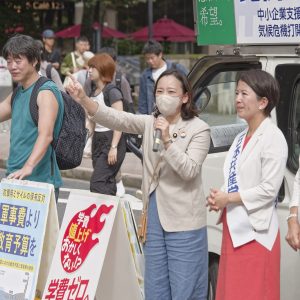 音楽ライブが始まりそうな雰囲気に、人が立ち止まります。観察する人、スマホを向ける人、スピーチをじっと聞き、言葉が詰まると拍手で励ます人。「何かのイベントかと思ったら共産党でびっくりした。まじで」と話す会社員は、チラシを受け取って振り返りながら帰っていきました。