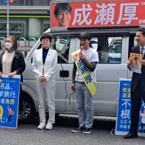 演説会後、田村氏が「一歩踏み出していただくことが大きな力になる」と声をかけると、参加者2人が入党を決意しました。