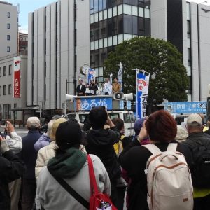 訴える成瀬候補。右端からから、宮本徹前衆院議員、成瀬厚市議補選候補、清水とし子都議、岡田日野市議=6日、日野市(宮本徹前衆院議員のXより)