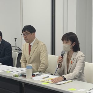 各党議員が参加。日本共産党のアオヤギ有希子都議が都議会の状況を報告し、吉良よし子参院議員が連帯メッセージを寄せました。