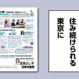 自民現職は、都議会自民党の裏金問題について「真摯(しんし)に反省し…改革に取り組んでいきます」(フェイスブック1月27日付)などとしていますが、最近の議会報告ビラや後援会資料、同問題への言及は見られません。駅前演説や都政報告会を開く一方、バス停わきなどの目立つ場所に地元選出衆院議員との連名ポスターを張り出しています。