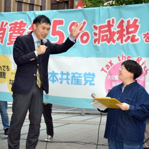 東京都議選・杉並区(定数6)で日本共産党の原田あきら都議を再び議会に送るため、山添拓政策委員長・参院議員が31日、阿佐ケ谷駅前で演説し「鋭い論戦は他党からの評価も高い。都議会になくてはならない人」と訴えました。緑の党グリーンズジャパンのブランシャー明日香・杉並区議も応援のスピーチをしました。