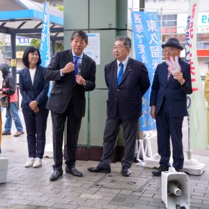 大河原雅子・立憲民主党衆院議員が駆け付け、「都民の命と暮らし、子どもたちの将来に向け全力で子育て支援、教育の拡充を掲げた清水さんの政策は、市民の声を政策にしたもの。総力を挙げて都議会に必ず送ろう」と語りました。