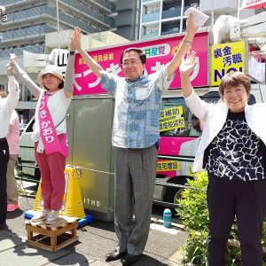 日本共産党の小池晃書記局長は19日、町田市(定数4)で池川友一候補の、杉並区(定数6)で原田あきら候補の応援に入り、「誰が落ちてもおかしくない大激戦です。支持の輪を広げに広げ、必ず勝利を」と呼び掛けました。
