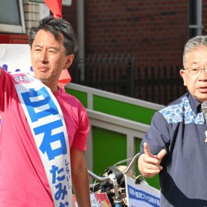 日本共産党の志位和夫議長は20日、東京都議選で豊島区(定数3)から4期目をめざす米倉春奈候補を押し上げようと、大塚駅前に駆けつけ、「当落線上でしのぎを削る大接戦です。最後の最後まで支持・支援を広げに広げていただき、必ず勝利を」と呼び掛けました。