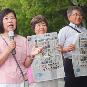 アオヤギさんは「選挙中に掲げた公約や頂いた切実な声を、都議会に届けられなくなったのは残念で悔しい思いです。引き続き、みなさんと一緒に公約を実現する立場で頑張りたい」とあいさつ。事務所長の横山敏郎さんは「要求を実現する共産党都議団の役割はすごいと実感しています。再び八王子から共産党都議を出そう」と訴えました。