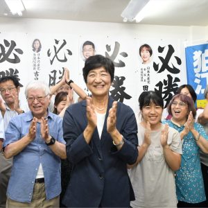 板橋区では、竹内愛候補が1票を争う大接戦に競り勝ちました。22日、投票箱が閉まった午後8時をすぎると、支援者が続々と板橋地区委員会事務所に駆け付けました。当確が出ると涙を流しながら喜び合い「バンザーイ」「ヤッター」と歓声が鳴りやみません。