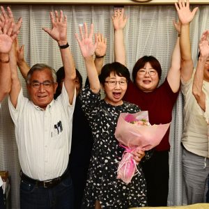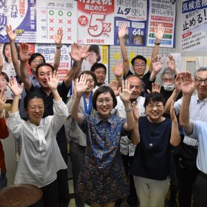 22日午後10時半、原田あきら都議の当選が判明すると、事務所に集まった人たちは安どの表情を浮かべ喜びあいました。