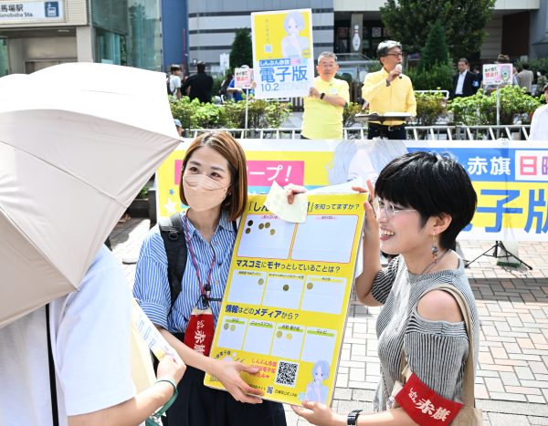 小池晃書記局長や山本豊彦日曜版編集長、日曜版記者が電子版の魅力を訴え、小池氏は「いよいよ電子版がスタートしました。『赤旗』といえばスクープ。忖度(そんたく)なく切り込み、自民党を追い詰めてきました」と日曜版最新号も紹介し購読を訴えました。