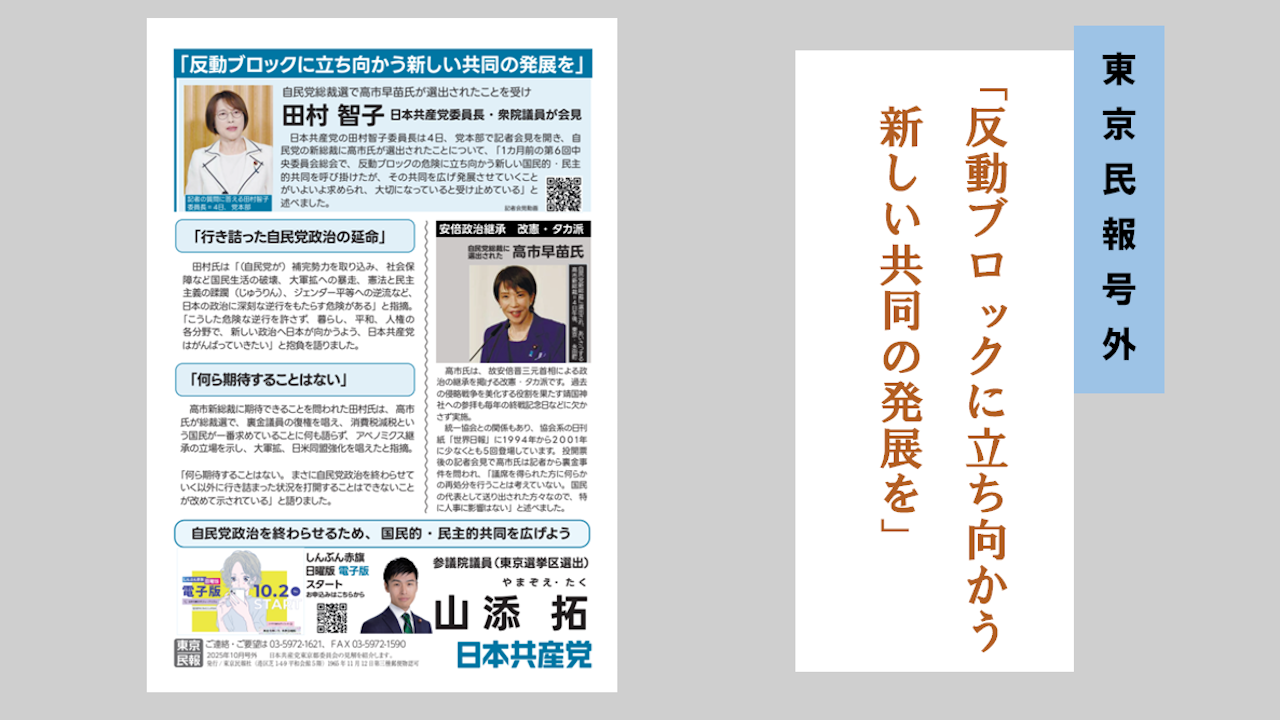 改選後初の東京都議会定例会は9日、閉会しました。最終本会議で、日本共産党が提出した中小企業の賃上げ応援条例案を都民ファーストの会、自民党、公明党、立憲民主党系、国民民主党、参政党などの反対多数で否決しました。共産党、「グリーンな東京」は条例案に賛成しました。
