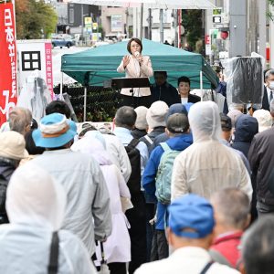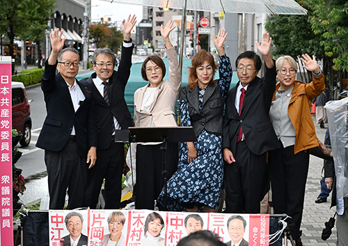 日本共産党の田村智子委員長は11日に東京都葛飾区で行った街頭演説で、目前に迫った区議選(11月2日告示、9日投票、定数40)の三小田准一、中村しんご、木村ひでこ、片岡ちとせ=以上現=、中江秀夫=元=の5候補とともに訴え、「日本共産党の躍進こそが、暮らしを守る政治への転換の力」と訴えました。