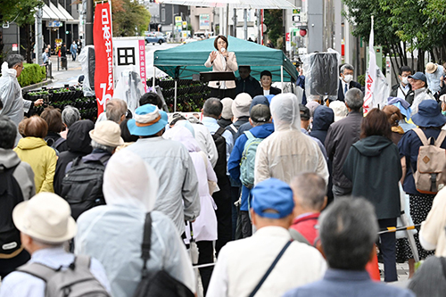 日本共産党の田村智子委員長は11日、東京・葛飾区内で、自民・公明の連立政権崩壊など、激動する国政の状況について街頭で演説し、「自民党政治を終わらせるためにたたかい、新しい政治の展望を示すためにがんばる」と訴えました。あわせて、11月2日告示、9日投票の葛飾区議選での共産党5人全員勝利にむけた支援を多くの聴衆に呼び掛けました。(関連記事)