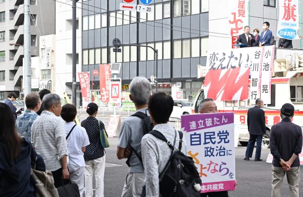 「外国人への根拠のない差別をあおる国、憲法を壊して戦争する国に向かうのか。希望ある政治を実現するためにも、企業・団体献金全面禁止を求め、米国言いなり・大企業中心の政治のゆがみをただす日本共産党の前進が必要だ」と述べ、「新しい国民的、民主的な共同を広げ、一緒に新しい政治をつくろう」と呼び掛けました。