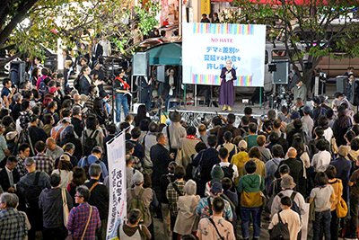 街宣には日本共産党から田村智子委員長があいさつし「差別はまさに戦争につながる」とのべ、「みなさんと一緒に差別に反対し、社会をかえていきましょう」と訴えました。吉良よし子、辰巳孝太郎両党参院議員が登壇、小池晃党書記局長が参加しました。また、立憲民主党、社民党、れいわ新選組の国会議員があいさつしました。