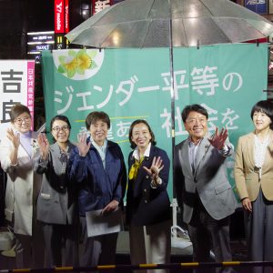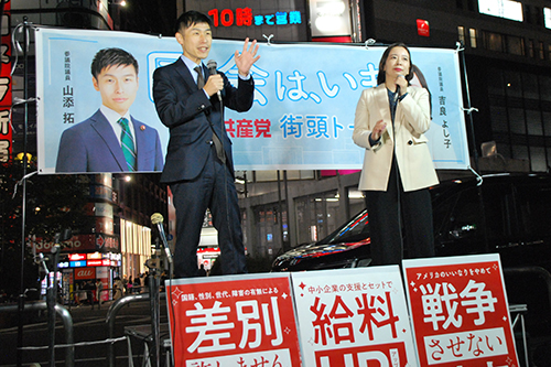 日本共産党の山添拓、吉良よし子両参院議員は23日、新宿区のJR新宿駅東口で「国会は、いま」をテーマにトーク宣伝を行い、軍拡や医療費削減を押しつける自民党政治を終わらせるため「先頭に立ってたたかい抜く」と語りました。多くの宣伝ボランティアが駆け付け、会社帰りのスーツ姿の人らが足を止め聞いていました。