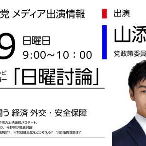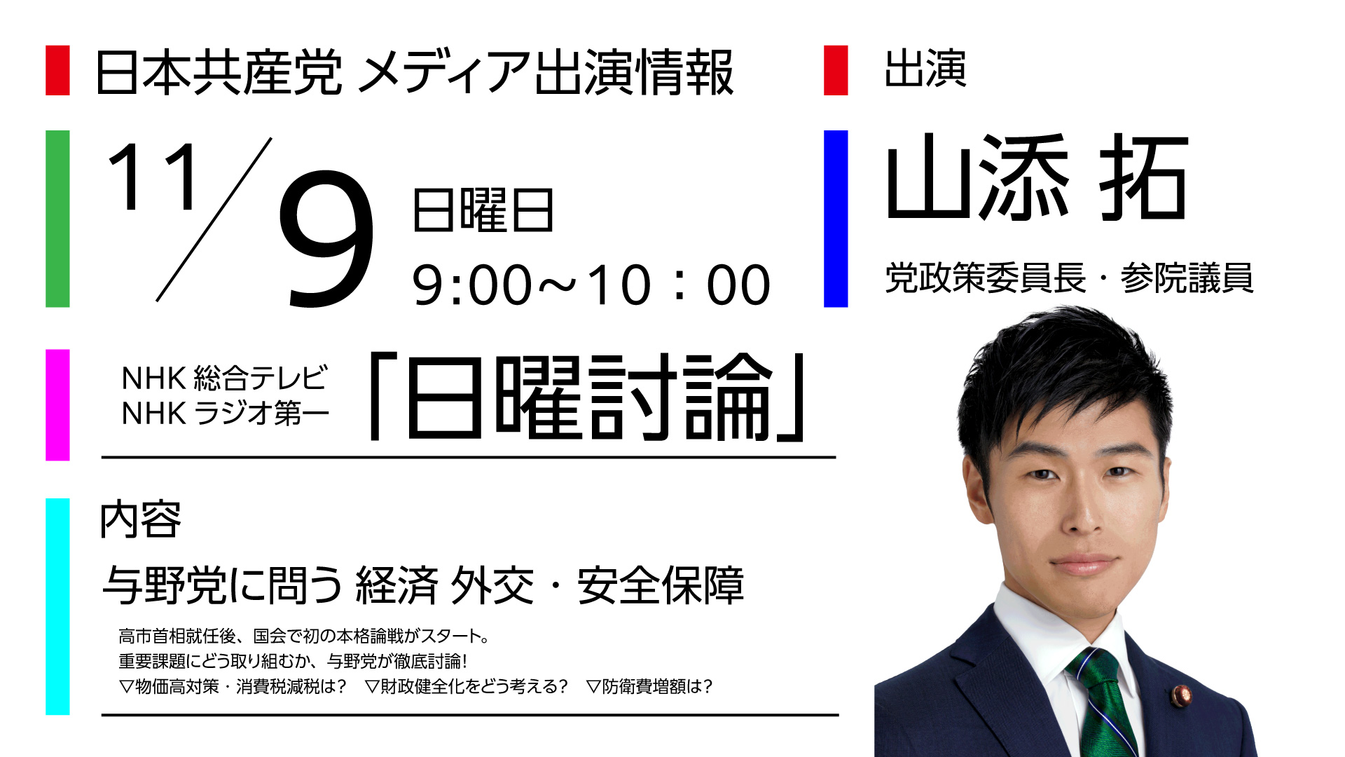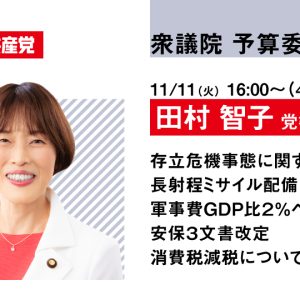 【メディア出演】11/9(日)田村智子委員長がTBS「サンデージャポン」に出演します お知らせ 0 2025-11-08 11月9日(日)9:53~11:23 TBS「サンデージャポン」【内容】本格化した国会論戦、直近の政策課題、藤田氏の公金還流疑惑の「赤旗」報道をめぐる対立についてインタビュー