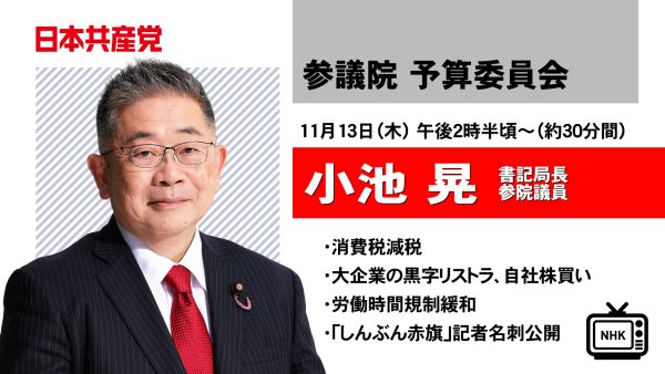 【国会質問】11/13(木)小池晃 書記局長・参院議員が参議院予算委員会で質問します お知らせ 0 2025-11-122025-11-13 11月13日(木)14:30頃~ ※時間は大きく前後する場合があります参議院 予算委員会・消費税減税・大企業の黒字リストラ、自社株買い・労働時間規制緩和・「しんぶん赤旗」記者名刺の公開など▶NHK中継があります。 インターネット審議中継はこちらから
