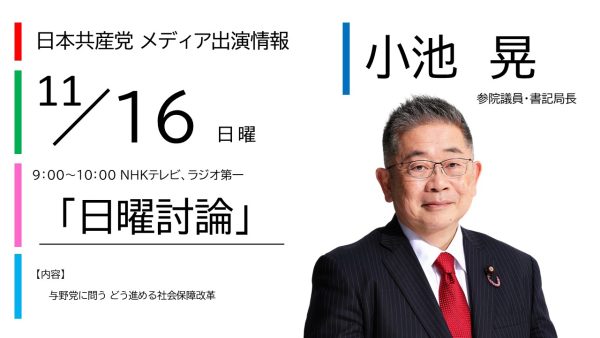 【メディア出演】11/16(日)小池晃書記局長が「NHK 日曜討論」に出演します お知らせ 0 2025-11-15 11月16日(日)9:00~10:00NHKテレビ総合、NHKラジオ第一「日曜討論」内容:「与野党に問う どう進める社会保障改革」各党の政策責任者が討論します。日本共産党からは小池晃書記局長が出演します。ぜひご覧ください。