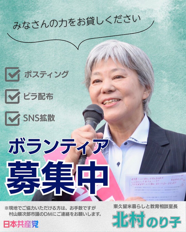 日本共産党北多摩北部地区委員会は、2025年12月14日の東久留米市議補欠選挙に北村のり子さんを擁立します。