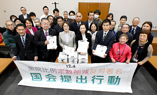 田村氏は、自民、維新両党が衆院議員定数削減法案を5日にも提出する動きだとして「こうした局面の中で、みなさんが粘り強い対話を続け、反対の署名を提出いただいたことに心から敬意を表します」とあいさつ。定数削減に賛成する世論は、裏金問題の解決や消費税減税など多くの国民の要求に政府・与党が応えていないことへの批判の裏返しだと指摘し、「定数削減反対も含め、日本共産党が先頭に立って要求、対話を一層広げていきたい」と述べました。