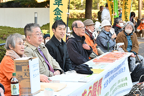 全日本年金者組合東京都本部の千野律子執行委員長は、多くの人が年末年始を祝いたいにもかかわらず「年金が物価高に見合っておらずそうはいかない」と指摘。「命綱である年金を引き上げようとしない高市早苗首相への怒りがマグマのようにたまっている」として、マクロ経済スライドを廃止して年金を引き上げるよう訴えました。