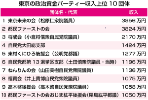 国会議員が代表を務める政党支部で最も多額の企業・団体献金を集めていたのは、自民党の萩生田光一幹事長代行で、6237万円。都議の政党支部では自民党の小松大祐・都議会会派幹事長で、1451万円を集めていました。