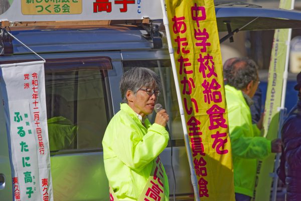 東京都東久留米市長選が7日告示(14日投票)され、日本共産党が自主支援する、「新しい市政をつくる会」の、ふるたに高子氏(67)=無所属新=が立候補しました。ほかに現職の、とみた竜馬氏(48)=無所属=も立候補し、一騎打ちです。