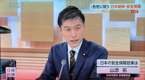 日本共産党の山添拓政策委員長は21日、NHK「日曜討論」に出演し、各党の安全保障政策責任者と議論を交わしました。各党から「抑止力強化」だとして軍拡ありきの主張が相次ぐなか、山添氏は「際限のない軍拡競争になる。その行き着く先が政府高官の『核保有』発言だ」と厳しく批判し、軍事一辺倒の転換を求めました。(関連記事)