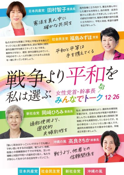 「戦争より平和を 私は選ぶ」をテーマに、4野党・会派の女性党首・幹事長による「みんなでトーク」の街頭宣伝が行われます。
