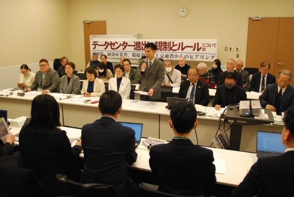 巨大データセンター(DC)の建設による電力消費や二酸化炭素(CO2)排出をはじめ自然や住環境への影響が各地で問題になる中、日本共産党の山添拓参院議員、清水とし子東京都議らは24日、住宅地への立地の規制や周辺への影響の情報公開について各省庁の担当者から聞き取りを行いました。東京、埼玉、千葉など各都県の関係区市議や住民も参加しました。