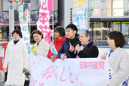 ちかざわ氏は、自民党、公明党などが支える現市政が30億円の道路建設を進めていると強調。「市民が暮らせる日野市へ一人一人の声を聴き頑張る共産党の4人を必ず市政へ送ってほしい」と呼びかけました。