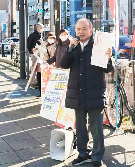 後援会員もマイクを握り、高市政権のもとで政治の右傾化がすすんでいることやベネズエラの事態への危機感を表明。田村智子委員長ら野党4党女性党首・幹事長が街頭宣伝で「憲法を真ん中にした確かな共同」を呼びかけたことへの感激を語り「頑張りましょう」と呼びかけました。