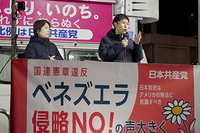 「米国はベネズエラ侵略やめよ」―。日本共産党の山添拓参院議員は9日、東京都新宿区の新宿駅東口で緊急街頭宣伝を行いました。足を止めて話に聞き入る人の姿が広がりました。