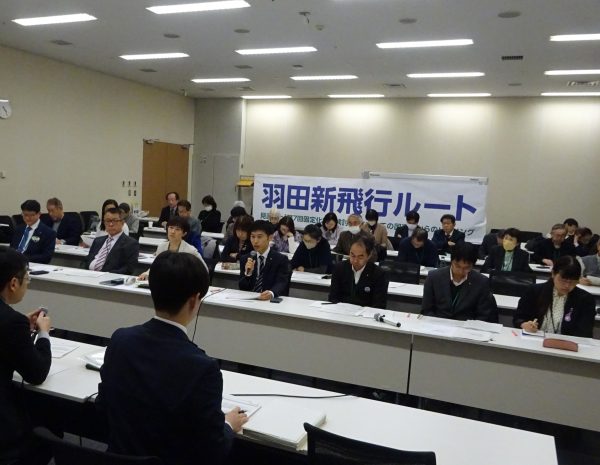 羽田新ルート都心上空を飛行する羽田空港の新ルートの「固定化を回避する」として国土交通省が設置した検討会の第7回会合が昨年12月に開かれたことについて、日本共産党の山添拓参院議員、藤田りょうこ東京都議、関係区議らは9日、住民とともに同省にただしました。