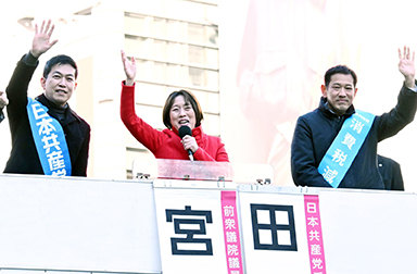 その上で、「こうした状況に多くの方々が不安を抱いている。また、市民と野党の共同で政治を変えようと頑張ってきた人たちがいる」「こうした声に応える政党が、今ほど求められている時はない」と強調。日本共産党が、社民党、新社会党とともに「憲法を真ん中にすえた新しい共同をつくり広げようとしている」と述べ、「暮らし、平和、人権―私たちは決してぶれません。国民のみなさんの要求に立って、自民党の政治を変えるためとことんがんばりぬく」と決意を表明しました。