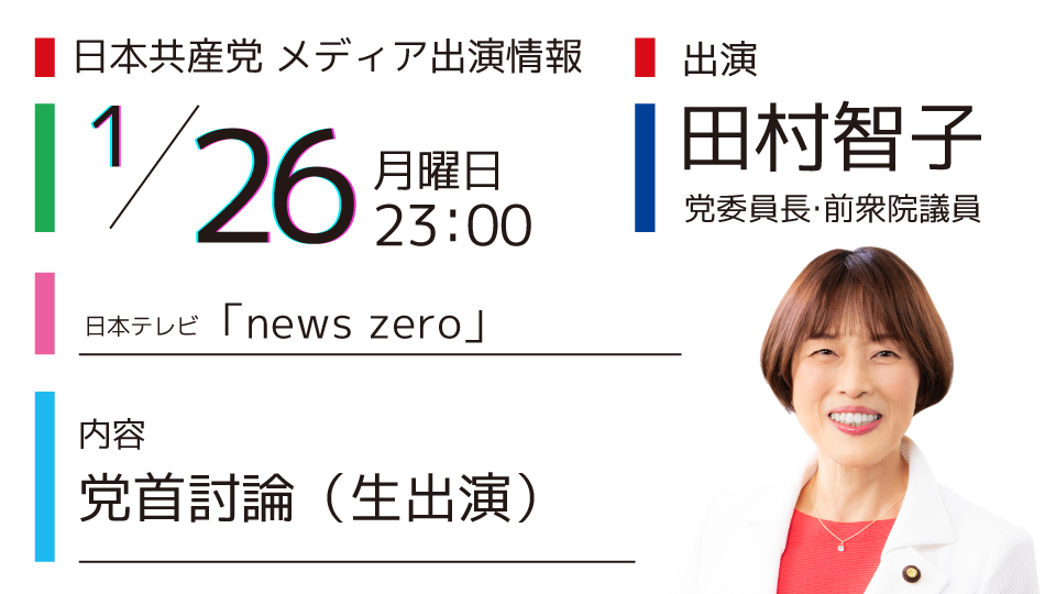 【メディア出演】1月26日(月)田村智子委員長が日本テレビ「news zero」に出席します お知らせ 1 2026-01-25 1月26日(月)23:00~日本テレビ「news zero」内容:党首討論(生出演) 日本共産党からは田村智子委員長・前衆議院議員が出演します。ぜひご覧ください。