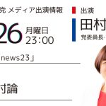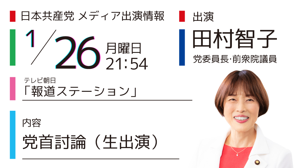 【メディア出演】1月26日(月)田村智子委員長がテレビ朝日「報道ステーション」に出席します お知らせ 1 2026-01-25 1月26日(月)21:54~22:40テレビ朝日「報道ステーション」内容:党首討論(生出演) 日本共産党からは田村智子委員長・前衆議院議員が出演します。ぜひご覧ください。